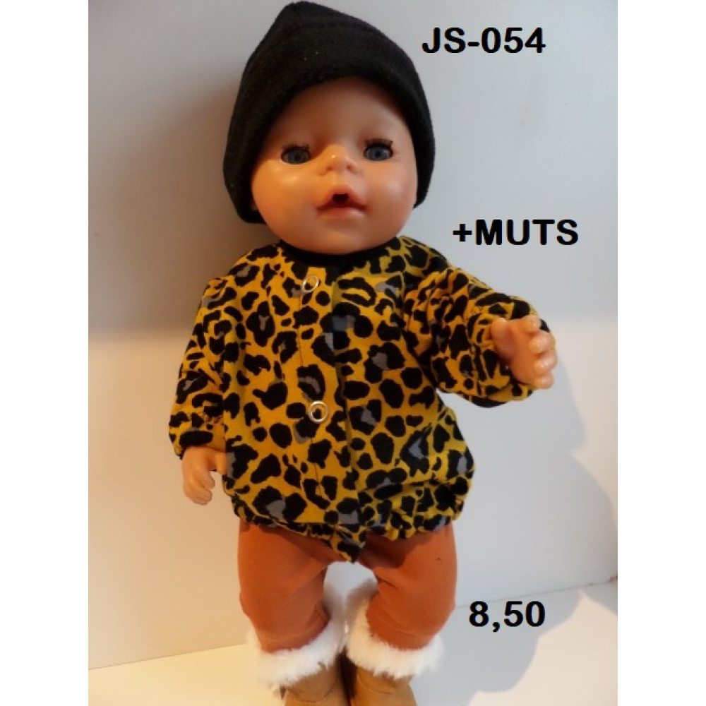 Jas van sweatstof okergeel met panterprint en zwarte muts